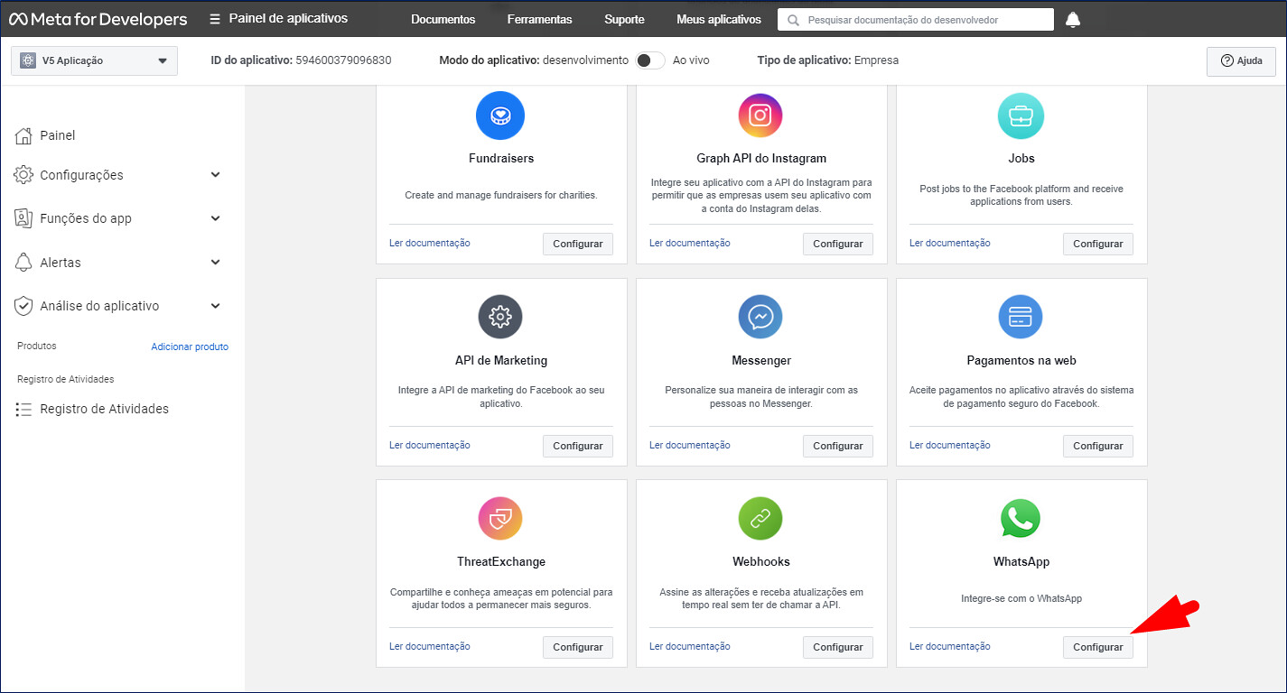 25. No menu lateral esquerdo, clique em WhatsApp e depois em Configuração da API.